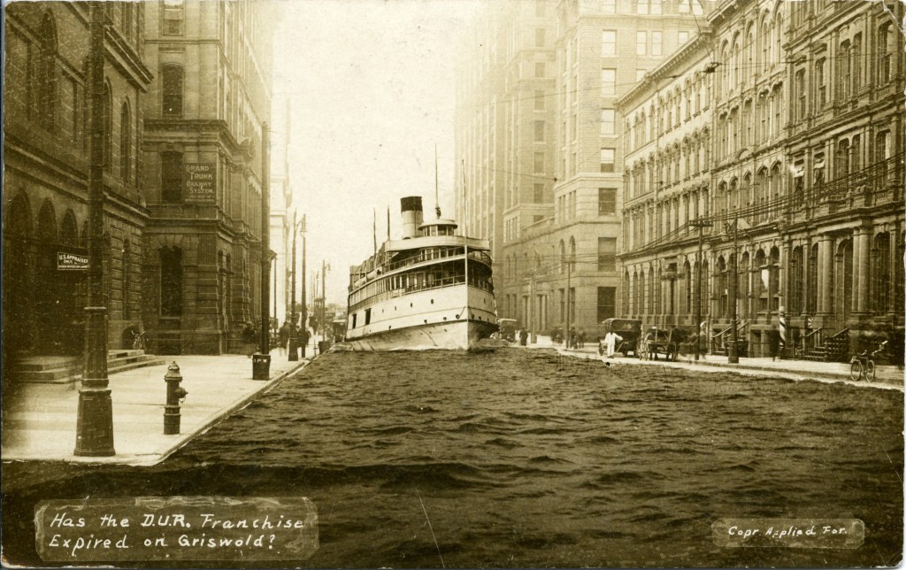 Over the past few weeks, you’ve been reading about the Detroit that never was. These novelty postcards depict a whole different kind of Detroit that never was. Rudimentary composite imaging techniques became popular in the early 20th century. It may not look as convincing as modern digital photographic manipulation, but audiences back then would have been surprised and delighted to see the streets of downtown transformed into the canals of Venice with large steamships traveling by. Look for more postcards depicting scenes of varying authenticity in our online digital collection.