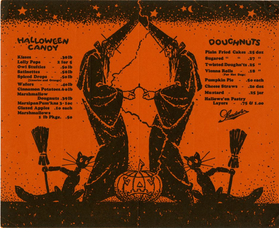 Happy Halloween! We hope you get to enjoy at least as many goodies as appear on this Halloween themed Sanders Confectionery menu from the 1930s. Or perhaps you would rather pass on such items as Mustard, Owl Stufties, Vienna Rolls (For Hot Dogs), and Cinnamon Potatoes.